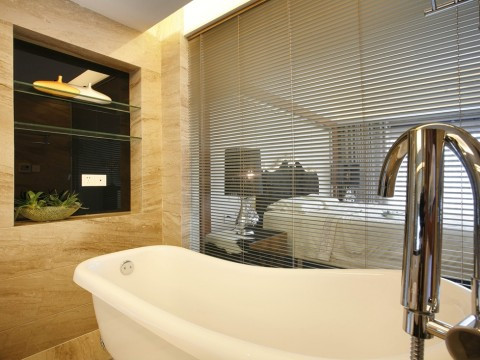 浴室和臥室是一體的,設計師考慮到業主的方便,晚上洗個熱水澡在睡覺一定很舒適吧~
