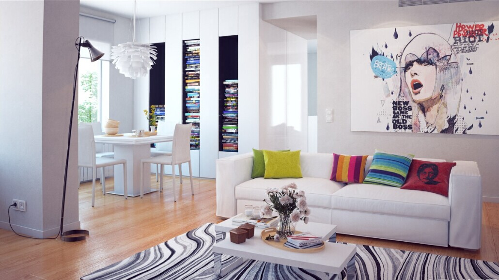 (2)顏色:多用黑、白、灰等中間色為基調(diào)色,通過色塊來表現(xiàn)內(nèi)涵,如澄色等暖色調(diào)表現(xiàn)家居的溫暖,紅、黃、藍(lán)、綠等相對跳躍艷麗的色彩提升感觀刺激等;